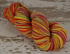 Up for grabs, a skein of Southern Delight with an optional trim (in purple or green). This colorway consisted of bright red, purple, light green, caramel brown, warm yellow